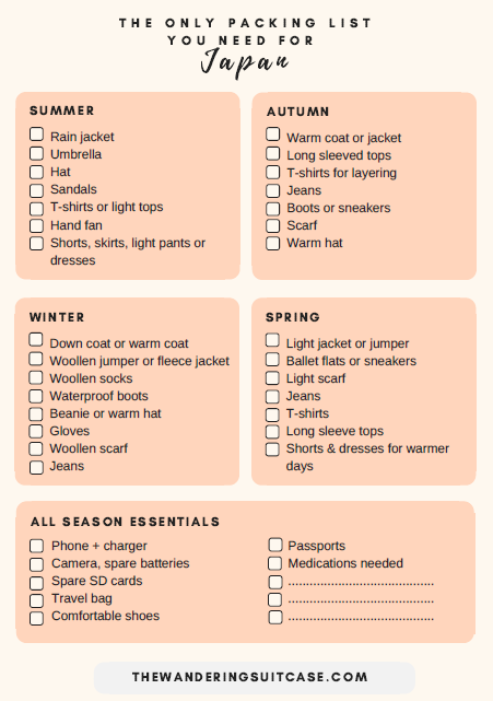 Of course, don’t forget to pack your Japanese Yen, credit cards, passport and boarding pass too!