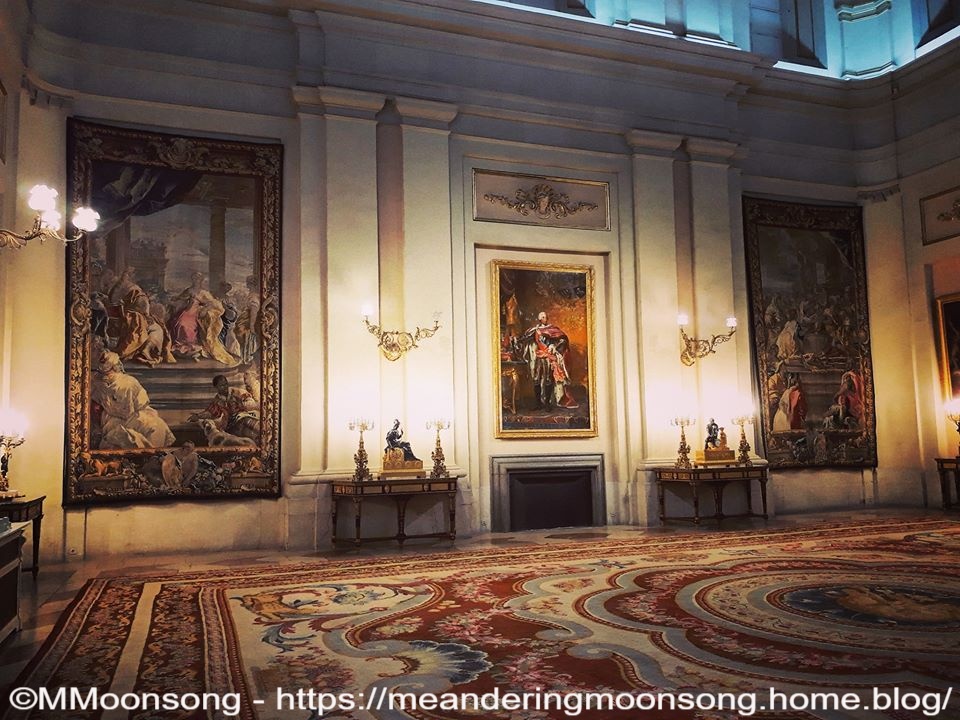 The Rococco and neo-classical interiors vied for our attention with great works of art especially while traipsing along the Gallery where works by grand masters, such as Goya, Caravaggio, El Greco and Velasquez, are exhibited. The Throne Room is also magnificent with its predominance of red and gold, its large mirrors and richly decorated furnishings, not to mention the immense fresco painted by Tiepolo on the ceiling. In the Royal Chapel, you will find the largest collection of Stradivarius violins in the world. And what about the Royal Dining Room filled with chandeliers we were told contained 1,000 candles each! So much luxury and riches exposed in what are known as ‘The Porcelain Room‘ and ‘The Oriental Room‘. Another tip – in each room, always remember to look up! Frescoes adorn almost every beautiful ceiling in these richly decorated rooms.