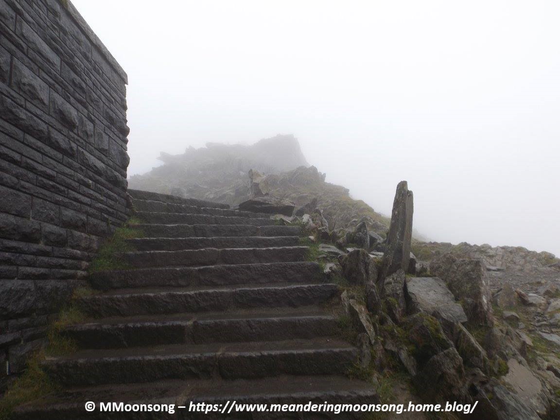 As we approached the summit, it was so cold that the drops of mist were like rain against the window panes. Everything was obscured as we entered a cloud of condensation, and as the doors opened to admit us to the coffee shop station at the top, we were told to be careful and not miss the train which would go back in 30 minutes, as there would be no more journeys for that day. Frozen stiff and knowing that the best was yet to come, we started walking towards the peak which, we were told, was only a few steep steps ahead. Wet, slippery, uneven steps, which one had to climb in the blinding mist and freezing wind. I admit at this point I was quite scared, but I consoled myself by thinking about the amazing view awaiting me. Snowdon is well known to offer one of the most extensive views of the British Isles – since in good weather Ireland, Scotland, England and the Isle of Man are all visible, as well as 24 counties, 29 lakes, and 17 islands.