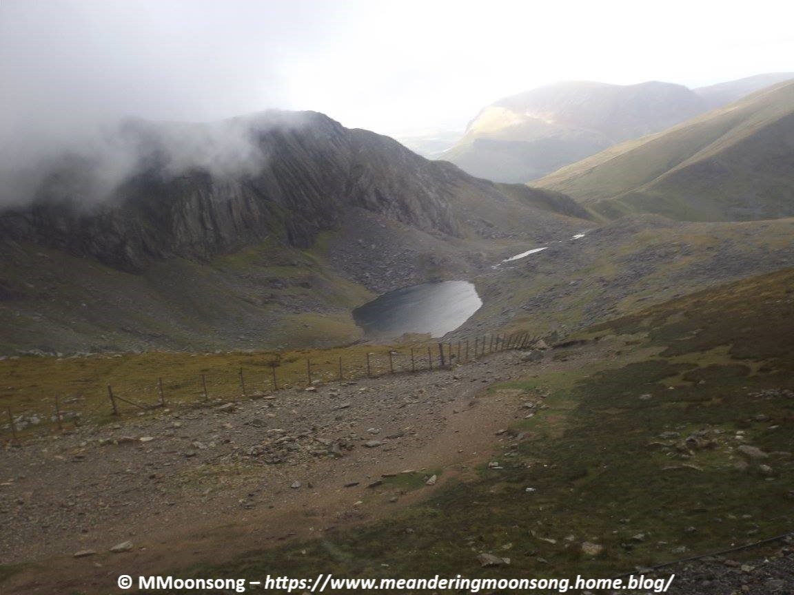Snowdon village could be seen below us at this point. We could also see the passage of time when we looked at the old quarry near it, which showed the sedentary rock blending into slate. Very colorful and interesting. As the train continued its journey upwards, we could also see the Hill of the Falcon in the distance – so called because it is the home of a large number of rare Peregrine Falcons, as well as Llydaw Lake, which is one of Snowdonia’s deepest lakes. Half-way up the mountain we stopped in order for the train to re-fill its tanks and for the tourists to have a cup of coffee at the halfway Café. It was really getting chilly at this point, and I bemoaned my fingerless gloves and thin hood, which weren’t nearly enough to protect me from the glacial climate. Beyond the coffee shop, we could see Glaslyn Lake, with its seemingly black and silent waters. I could very well understand how this strange place could inspire people to believe in the legend of the afanc, which is a water-monster who is thought to reside in it. Another legend relating to Snowdon Mountain relates how the giant Rhitta Gawr, who wore a cloak made out of men’s beards, was killed by King Arthur after trying to take his beard, and is buried at the top of Snowdon.